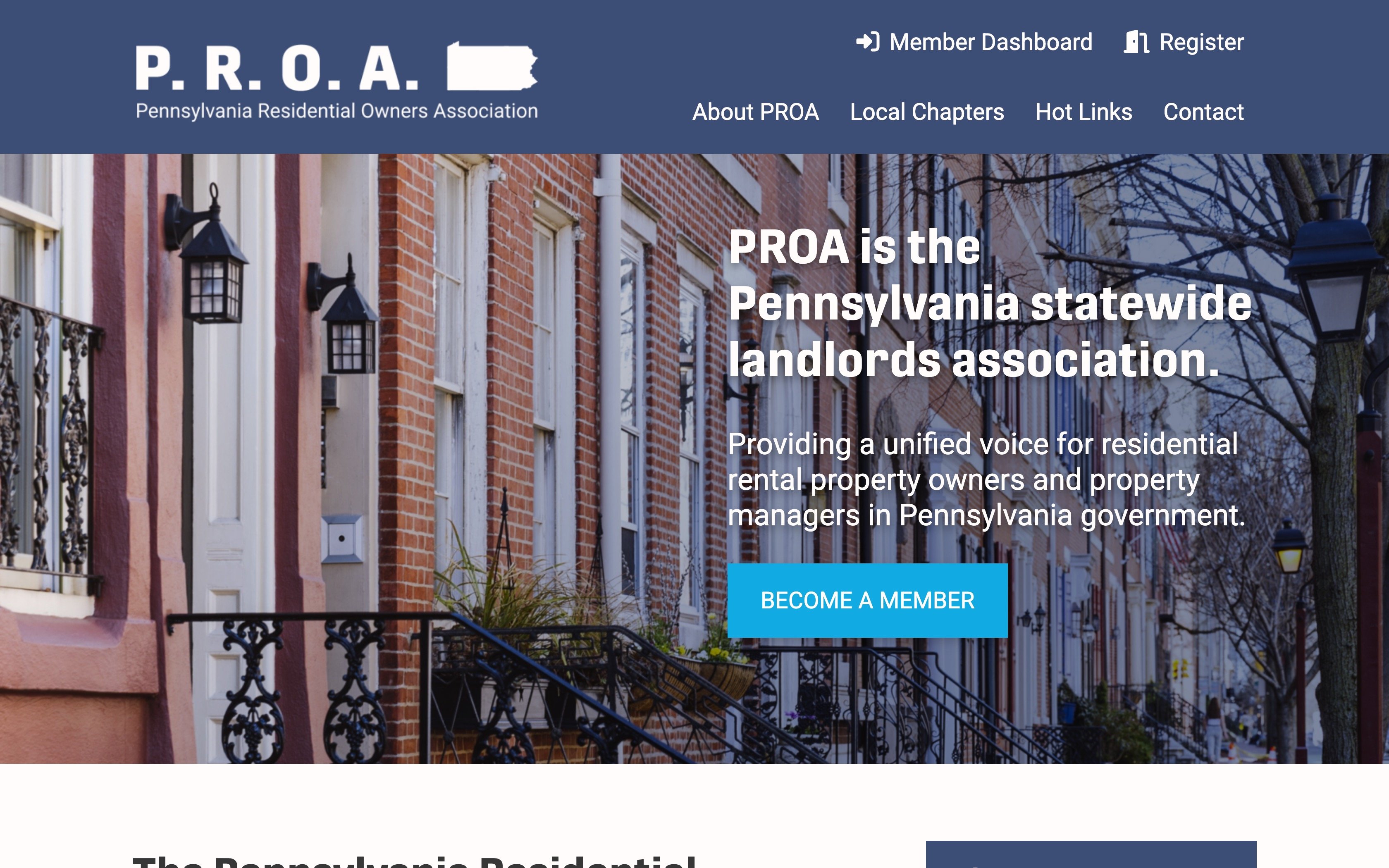 We recently launched a redesigned and rebuilt website for the Pennsylvania Residential Owners Association (PROA). PROA provides a unified voice for residential rental property owners and property managers in Pennsylvania government.